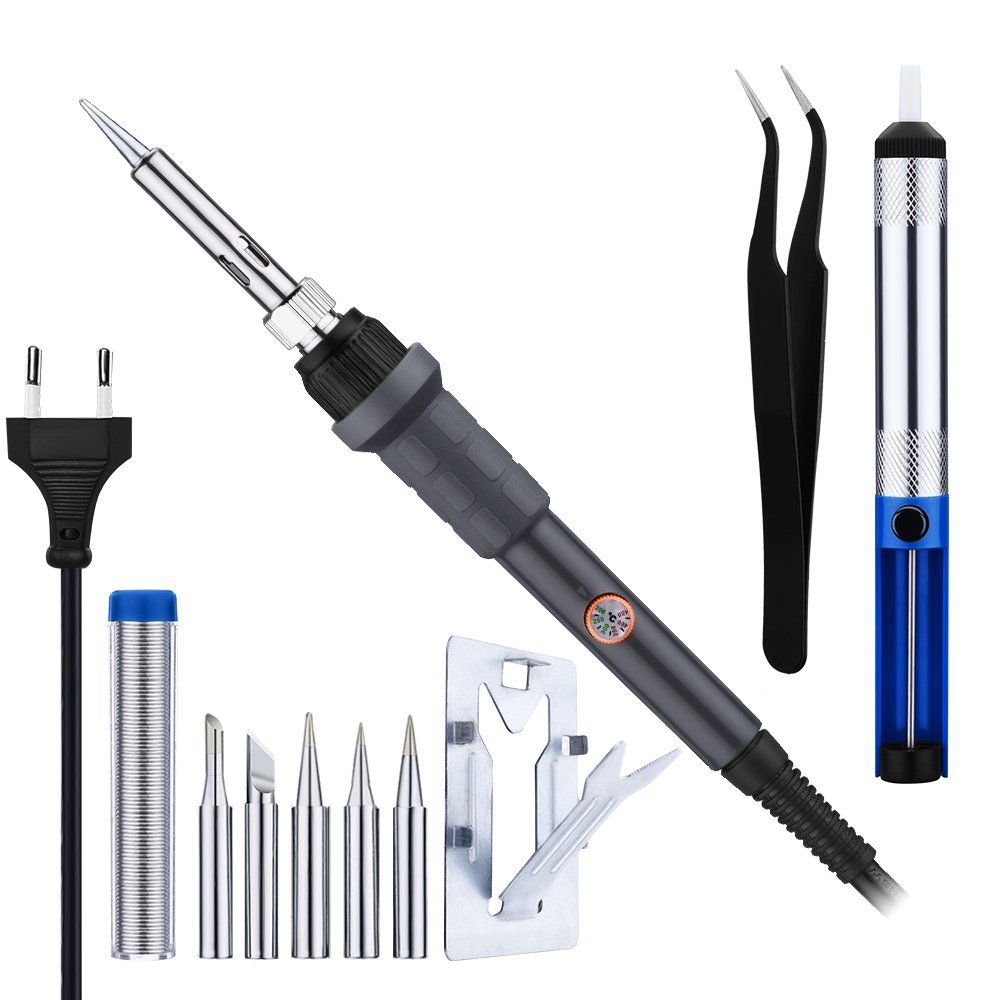 Kit del soldador, VicTsing 60W 220V Soldador de estaño de Temperatura Ajustable, 5 PCS Puntas diferentes, bomba desoldadora, soporte, pinzas antiestáticas y cable de soldadura de estaño.