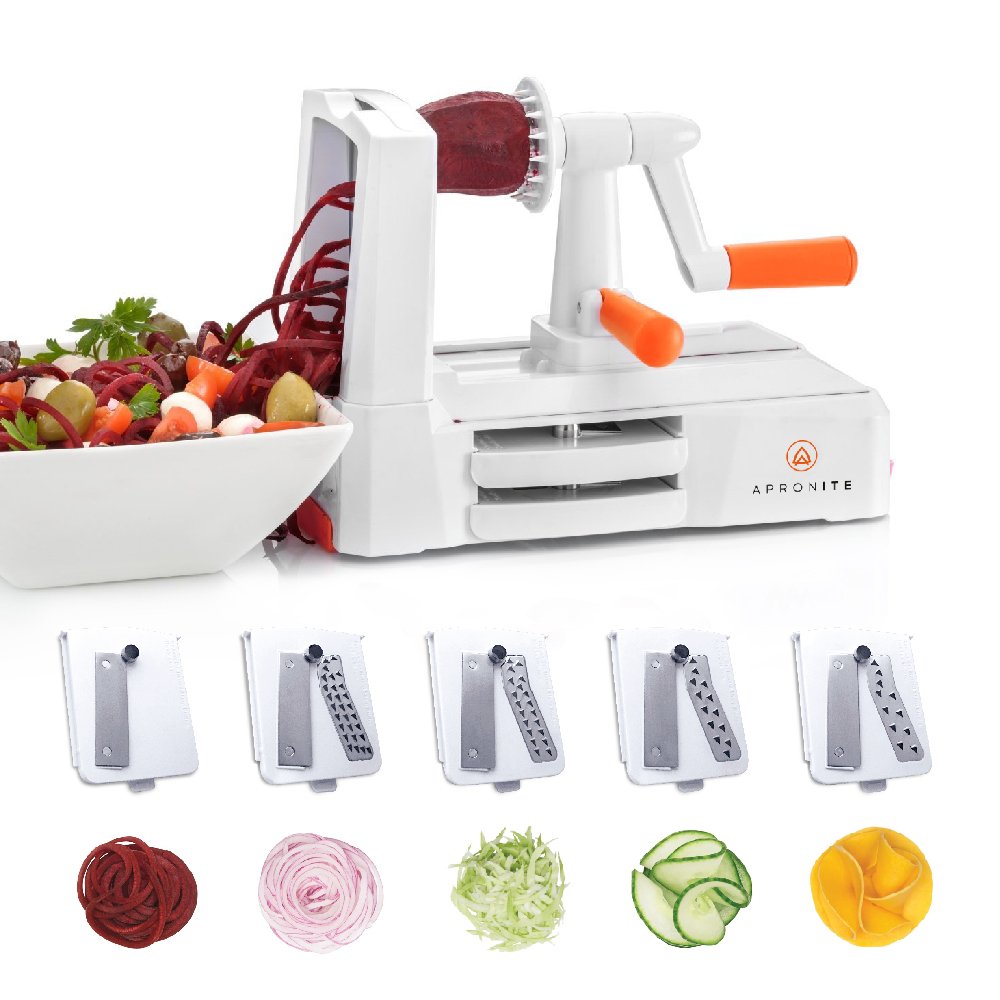 - ¿QUÉ CONTIENE EL PAQUETE? - El espiralizador Apronite tiene 5 hojas de acero inoxidable que vienen acompañadas con una caja de almacenamiento de las hojas, el cuerpo de gran resistencia con dos ranuras para cuchillas y una copa de succión enorme en la parte inferior para asegurar que el cortador se queda firmemente fijado en la encimera para posibilitar un funcionamiento seguro y fácil. El mango extensible se utiliza para cortar la fruta o la verdura en espiral de cualquier longitud.
