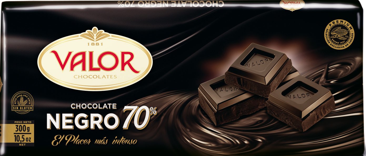 Negro 70% 300G. Ingredientes: Pasta de cacao, azúcar, cacao desgrasado en polvo, manteca de cacao, emulgente: lecitina de soja. Puede contener trazas de almendra, avellana y leche.